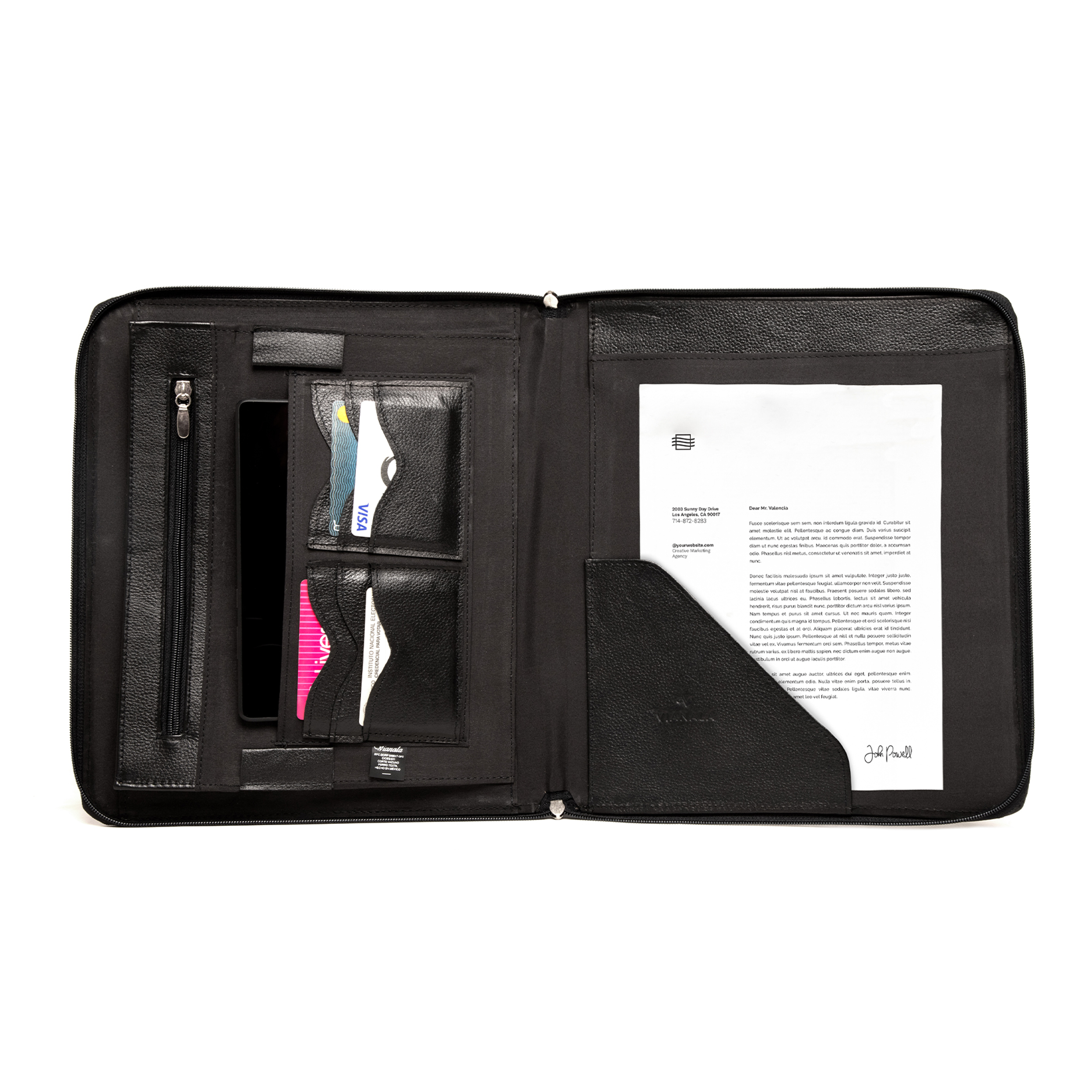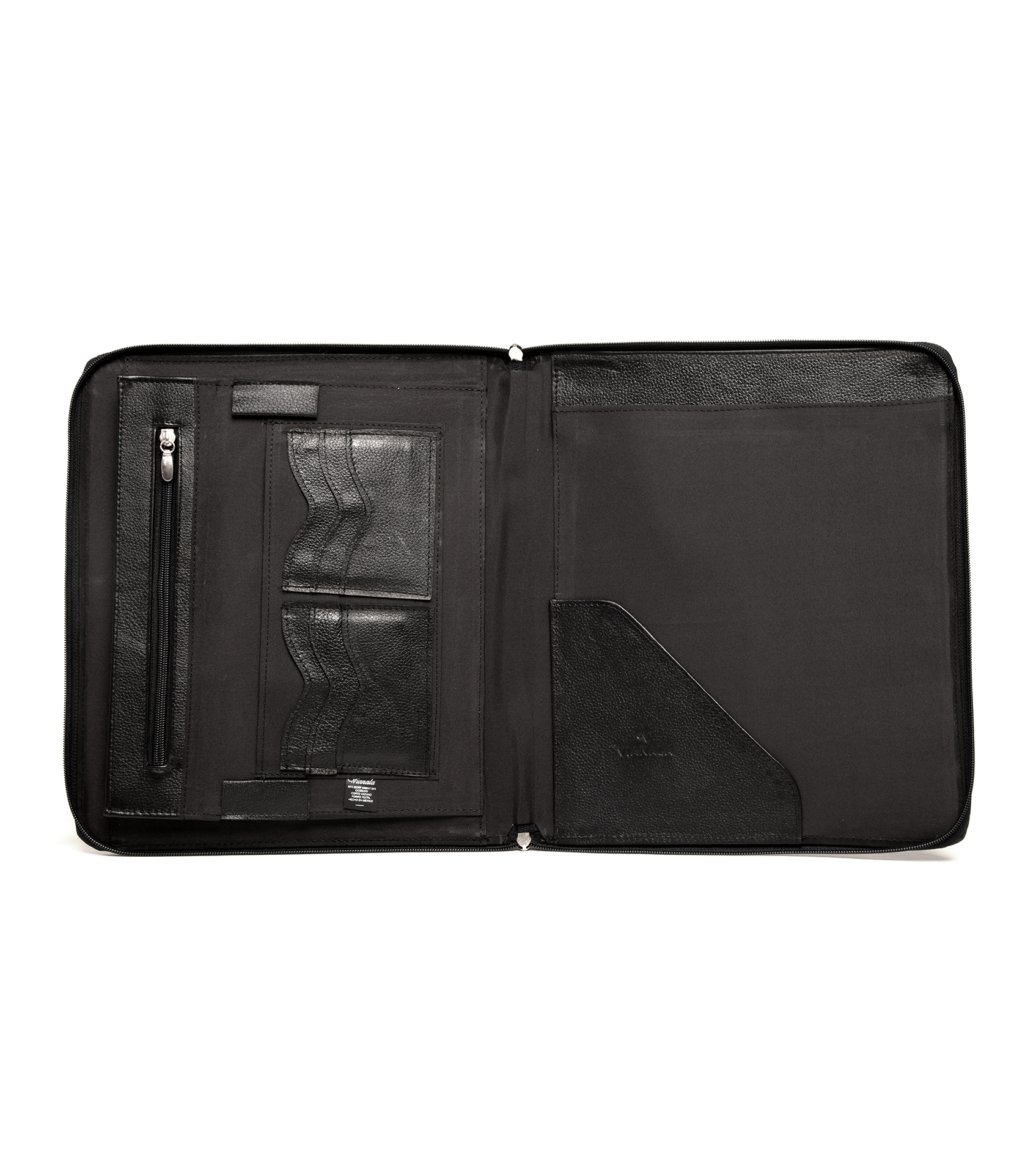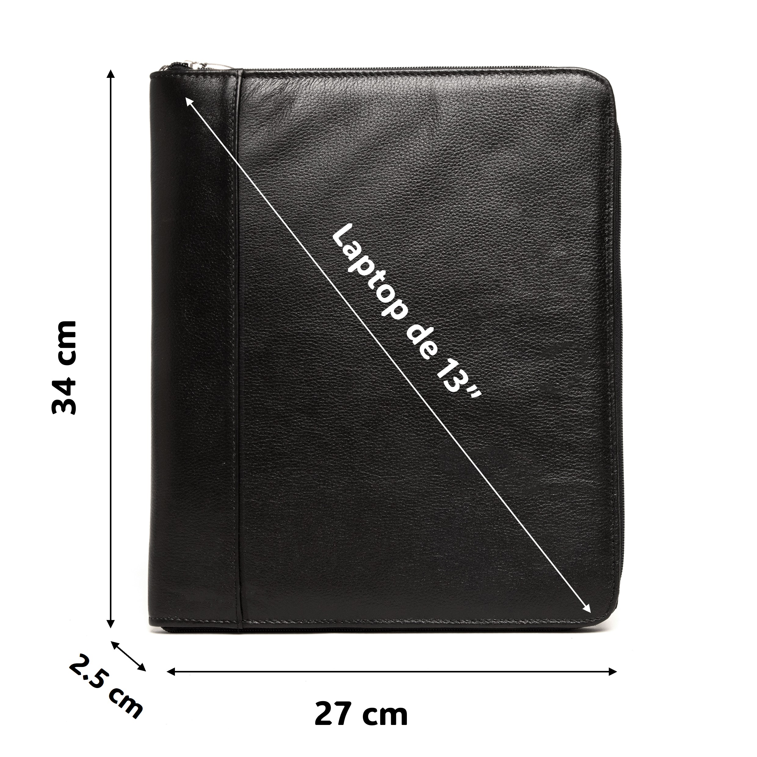 Carpeta con logotipo empresarial de piel genuina negra tamaño carta. Resguarda tu Laptop Slim de 13″, Ipad y documentos importantes. Cuenta con un sistema de cierre zipper.  Recuerda que la piel es un producto natural, por lo que marcas y rasguños son completamente normales sin afectar de ningún modo el desempeño de tu Omine. Medidas: 34 x 27 x 2.5 cm. En el compartimento interior tipo folder le cabe tu lap 13″   En somos emprendedores de oficio y tradición leonesa que, profesionalizando la marroquinería, proponemos soluciones con productos de diseño funcional, acordes a la forma en que se desenvuelve el hombre en su medio al que propone soluciones. Proyectar seguridad y formalidad protegiendo tus gadgets y otros elementos utilitarios.